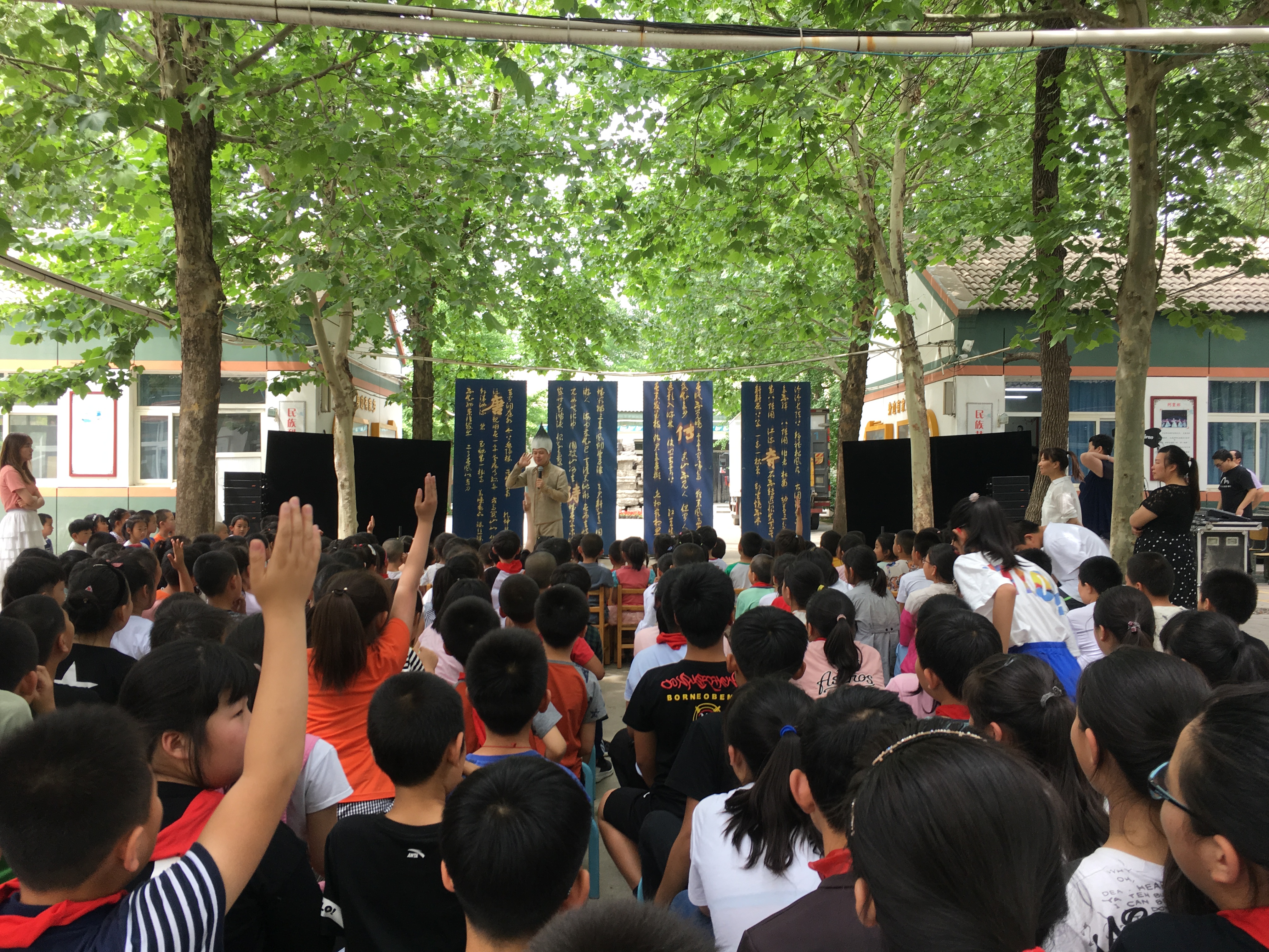 由北京缤纷无限儿童艺术剧团推出的原创儿童剧《唐诗传奇》,于2019年5月24日来到了大兴区庞各庄镇薛营回民小学,奉献给同学们,这部戏的故事都是由一位神奇的毛笔大侠引发的,他以无穷的魔力带领两个孩子穿越时空,来到大唐王朝国都长安,同唐朝大诗人李涉、贾岛、韩愈一起经历了欢乐奇妙的传奇故事,本剧的主题是弘扬国学的精华,中华文化的精髓,以唐诗传奇的故事激发当代学生对传统文化的向往,从而引导学生们进入传统文化的宝库中去,传统文化现代体现寓教于乐,全新的形式感是本剧的艺术追求。首先在本剧创作中采用了三段式的剧本结构,用三个唐诗故事贯穿全剧,每个故事都讲述同一个主题——唐诗。让师生们知道唐诗不光背诵,还要知道唐诗背后的故事,剧中体现的唐诗却都是语文课本里的,这样通过戏剧的形式展现给学生们,使他们在学习中更加有兴趣,我们这部戏还把唐诗谱成现代感极强的歌曲,演出中与台上台下的学生们大量互动,让学生们参与到演出中,达到了台上台下共诵唐诗的动人场面。我们今后还要多深入学校演出,因为在那里才能捕捉到鲜活的创作灵感,不断创作出学生们喜欢的艺术品。习总书记在文艺工作座谈会上的讲话中指出:创作无愧于时代的优秀作品时谈到“只要有正能量、有感染力”,能够温润心灵,启迪心智,传得开,留得下,为人民群众所喜爱,这就是优秀的作品,我们认为儿童剧应该如此,因为它的观众对象是我们国家民族的未来,儿童剧工作者,必须有社会责任,所以非常感谢教委启动的民族艺术进校园的项目,作为生产单位,我们今后会创作出更多更好的艺术作品奉献给孩子们。
